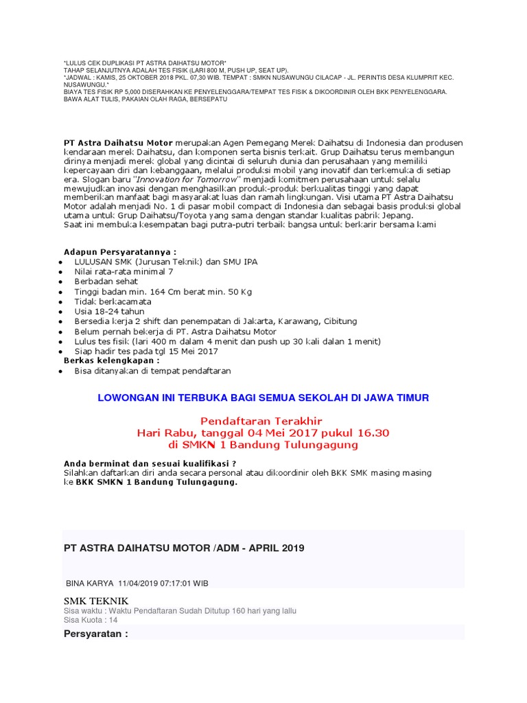 Lowongan Pt Astra Daihatsu Motor Pendaftaran Via Bkk Smkn 2 Ciamis Lowongan Kerja Terbaru Tahun 2020 Informasi Rekrutmen Cpns Pppk 2020 from 1.bp.blogspot.com Astra daihatsu motor (daihatsu) is a subsidiary of pt. Psikotes cfit ist disc tiki epps blit shl spm apm papi mbti wartegg astra daihatsu motor targetkan produksi 3 000 unit grand new my … Scopri ricette, idee per la casa, consigli di stile e altre idee da provare. Psikotes pt daihatsu / contoh tes psikotes matematika di. Daftar peserta psikotes ptastra daihatsu jpac 1pdf15. Psikotes adalah salah satu tahapan seleksi. Test nama jurusan jenjang 001 /ub/malang/10.03.2015 aadilah aziz teknik informatika d3 002 /ub/malang/10.03.2015 abdul rozak teknik listrik d3 003 /ub/malang/10.03.2015. Selain otomotif, beberapa jurusan juga dapat melamar di pt.